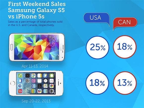 尽管在发布之初在吐槽创新不足,但根据市场调查公司iQmetrix提供的调研数据显示,三星GALAXY S5在北美市场的美国和加拿大的首周销量表现不俗,分别占当地市场该周智能手机销量的25%和18%,高于苹果iPhone5s去年在两地的首周销量比例。