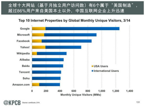 在今天召开的Code Conference大会上,被誉为“互联网女皇”的玛丽·米克尔(Mary Meeker)公布了2014年的年度互联网趋势报告。报告显示,基于月独立用户访问量数据,全球10大网站中有六家来自美国,四家来自中国,分别为阿里、腾讯、百度、搜狐。