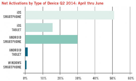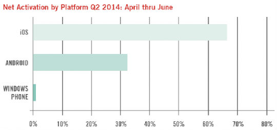 趋势网(微博|微信)讯:苹果的iOS操作系统仍占据着企业市场,即使在2014年第二季度其设备激活数下降5%变成67%;安卓设备激活数跟上个季度一样,都为32%;而Windows Phone的则和前5个季度一样,维持在1%。