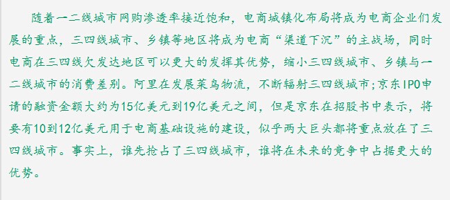 随着一二线城市网购渗透率接近饱和,电商城镇化布局将成为电商企业们发展的重点,三四线城市、乡镇等地区将成为电商“渠道下沉”的主战场,同时电商在三四线欠发达地区可以更大的发挥其优势,缩小三四线城市、乡镇与一二线城市的消费差别。阿里在发展菜鸟物流,不断辐射三四线城市;京东IPO申请的融资金额大约为15亿美元到19亿美元之间,但是京东在招股书中表示,将要有10到12亿美元用于电商基础设施的建设,似乎两大巨头都将重点放在了三四线城市。事实上,谁先抢占了三四线城市,谁将在未来的竞争中占据更大的优势。