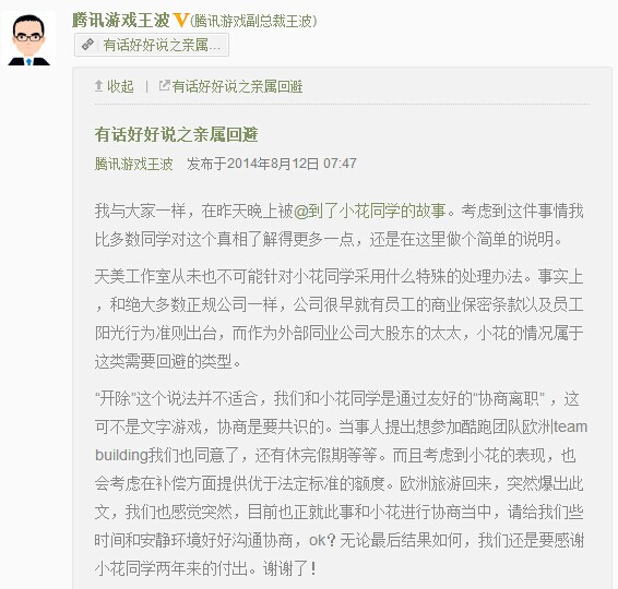 趋势网(微博|微信)讯:数天前,腾讯手游一名叫陈小花的员工发布了一篇长微博,向外界哭诉自己苦心奉献多年的公司如何一步步将自己逼走。文章一出立刻引来了大量围观与争论,其中大多是做手游的同行。一篇看似普通的文章为何引来如此多的关注与口水战?这与陈小花本身的身份有很大的关系:她的丈夫正是莉莉丝游戏的CEO王信文,该公司开发的手游“刀塔传奇”打破了腾讯的垄断,是一款近两年来非常难得的游戏。而腾讯给出的回复也简单明了:这样做只是为了避嫌。