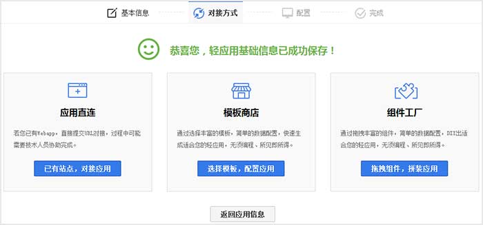 完成基本信息填写,需选择对接方式。目前对接方式有三类:应用直连、模板商店和组件工厂。这里以应用直连为例讲解。直接对接:需准备以下材料即可简单接入