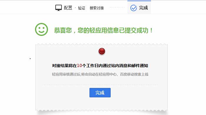 完成对接方式选择,完善对接内容之后准备提交上线。点击“提交”按钮,确认您所填写的轻应用信息是否正确,如您信息已填写完整,您可立即提交对接移动搜索,让您的应用和服务触手可及。提交轻应用成功后,您可以在轻应用管理中管理和再次编辑您的应用信息。为了确保审核的顺利通过,建议提交前,仔细阅读移动轻应用接入规范,以便核对您提交的信息和内容是否符合规范。