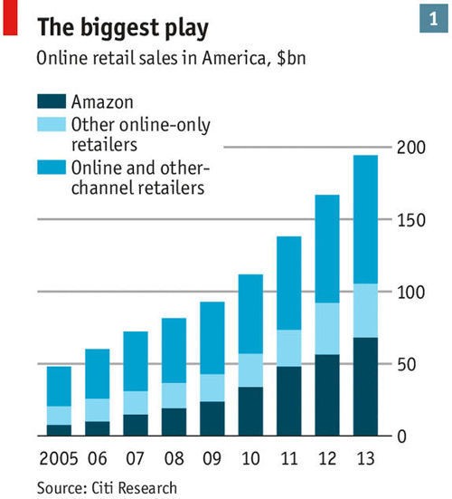 部分业内人士将谷歌视为亚马逊的最大威胁,但也有人指出拥有电子商务业务的沃尔玛才是亚马逊的真正敌人,因为沃尔玛的电子商务营收增速已经超过了亚马逊。而中国的阿里巴巴也将通过IPO筹集到大笔资金。社交电子商务初创网站Wanelo也成为新一轮网络电商的佼佼者。而移动购物平台Instacart甚至已经推出了商品“一小时送达”服务。