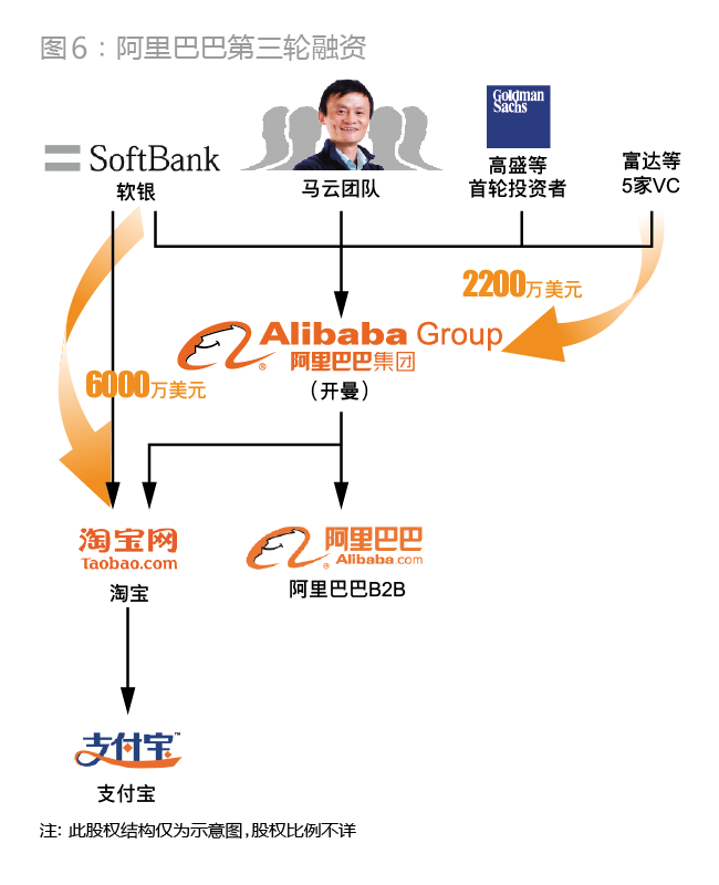 2003年下半年,阿里巴巴再次获得软银联合富达投资、寰慧投资和TDF合计8200万美元的投资。此次融资的背景是,eBay收购易趣网登陆中国本土,并控制了C2C市场80%的份额,对阿里形成大兵压境之势,为了应对eBay,阿里以攻为守推出淘宝网。8200万美元的融资中,软银的6000万美元便是单独注资给淘宝网的,而且它成了淘宝的大股东(图6)。