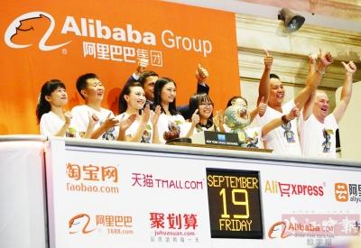 趋势网(微博|微信)讯:9月19日晚九点三十分,阿里巴巴在纽约证券交易所完成敲钟仪式,正式挂牌上市,股票代码为“BABA”。阿里巴巴股票发行价每股68美元,公司拟筹资218亿美元。根据这一定价,阿里巴巴估值达到1,680亿美元,成为美国规模最大的上市公司之一。