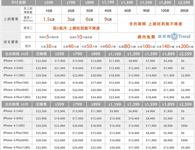 台湾大哥大iPhone6合约套餐分为24个月和30个月,每月保底最低599新台币,详情如下;