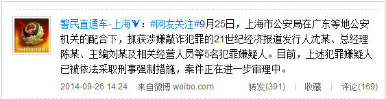 据上海市公安局官方微博报道称,上海市公安局在广东等地公安机关的配合下,抓获涉嫌敲诈犯罪的21世纪经济报道发行人沈某、总经理陈某、主编刘某及相关经营人员等5名犯罪嫌疑人。目前,上述犯罪嫌疑人已被依法采取刑事强制措施,案件正在进一步审理中。