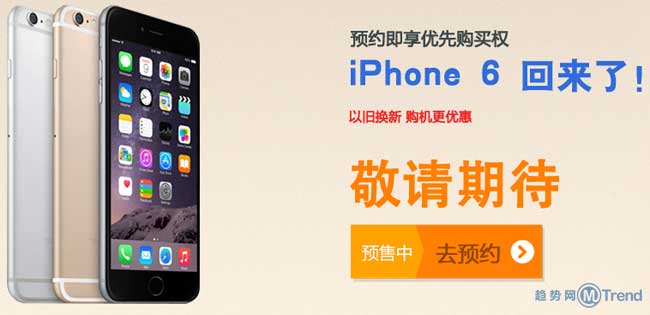 趋势网(微博|微信)讯:自9月30日工信部宣布通过苹果入网申请后,苹果便宣布iPhone6和iPhone6 Plus将于10月10日正式在华上市,10月17日发售。中国三大运营商移动联通电信,虚拟运营商苏宁互联蜗牛移动等,电商平台京东天猫一号店等及社会渠道国美迪信通等纷纷第一时间开放预约活动。苏宁率先公布今年的iPhone以旧换新计划,为果粉添加新款苹果6又增加了一点动力。但不是所有的iPhone都可以被回收,iPhone回收估价的金额不可以兑换成现金只能在店购买手机产品。