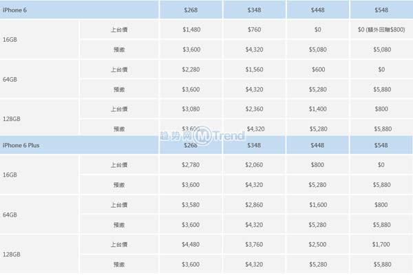 中国移动香港的iPhone6和iPhone6 Plus合约机协议期为24-36个月,24个月为例,分月费268港元、348港元、448港元、548港元4档,如果购买iPhone6,月费448和548均为0元购机套餐,其中548档还回赠800港元。而购买iPhone6 Plus的话,只有月费548档的是0元购机套餐。