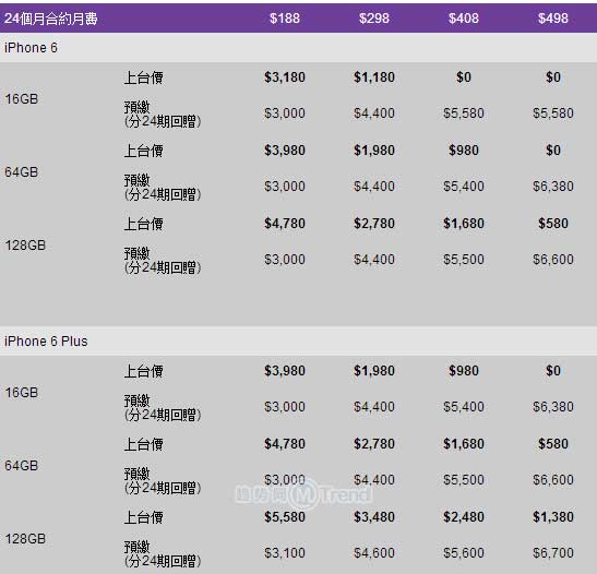 移动香港iPhone6/Plus合约计划套餐资费详情: