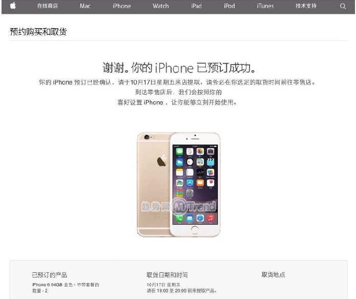 趋势网(微博|微信)讯:10月14日早上8点,苹果在线零售商店Apple Retail Store开启在线预约线下取货通道,预订成功后,到店领取苹果6要注意什么、等多久、需要什么证件、付现金还是刷银行信用 卡?由于这是果粉们以官方价最快拿到iPhone6和iPhone6 Plus的最主要方式(10月17日国行iPhone6开售第一天就可以前往线下苹果官方直营店领取),这次预购可谓是考验速度、耐力和运气的竞赛。