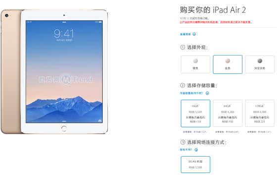 趋势网(微博|微信)讯:苹果在2014年秋季发布会上发布升级版iPad(命名为iPad Air 2),用户从10月17日起就可以通过苹果官网进行预订购,下周起发售,国行iPad Air2RMB3588起售,iPad mini3国行RMB2888起售。iPad Air2上市后Air1会降价100美元左右。