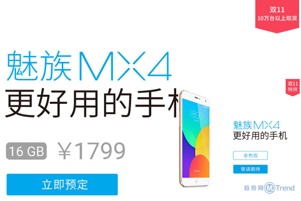 魅族这次可谓不遗余力的投入到双11活动,双11当天提供10万台以上的现货MX4供购买,同时还开放限量金色版魅族MX4作为双11特供。