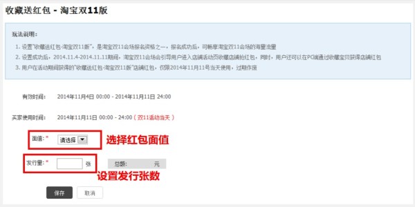 趋势网(微博|微信)讯:淘宝卖家如要参加双11淘宝嘉年华报名,需设置收藏送红包-淘宝双11版,整理红包设置流程、说明和规则等。