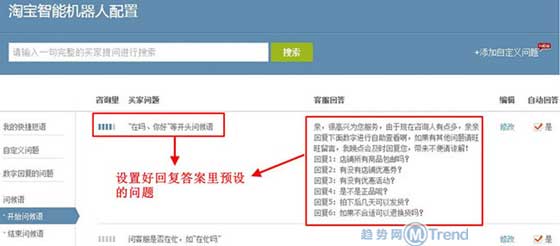 有五大类买家常用的问题:问候语、导购、活动优惠、发货查件、售后,机器人可帮助自动回复。在吗、你好等开头问候语;“谢谢”等感谢语;询问是否是正品;询问是否可以优惠;询问使用哪家快递;询问包邮;询问当天、第二天或指定日期能不能发货或什么时候发货;询问是否可以指定快递;询问几天能收到货,或某个时间点前能不能收到等。