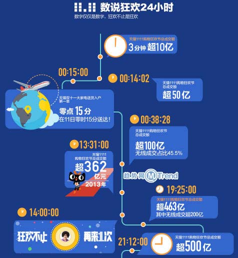 11月11日0点起,第3分钟超10亿,第14分钟天猫1111购物狂欢节总成交额超50亿,15分钟天猫双十一大家电送货入户第一单,第38分钟28秒,天猫1111购物节总成交额超100亿其中无线占成交额45.5%,11日13点31分天猫双十一交易额超362亿元,19点25分成交额超463亿元其中无线成交额超200亿元,21点12分天猫双十一完成500亿元成交额目标。
