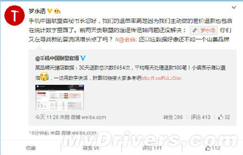 罗永浩随后在微博上回应称,退单率高的原因是锤子主动做的差价退款也包含在了统计数字里边。