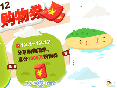 趋势网(微博|微信)讯:2014淘宝双十二1212购物券红包新增方法,分享购物心愿清单专辑可获取购物券,活动时间日期、活动入口、操作步骤、参与规定?分享淘宝双十二红包1212购物券抢法。