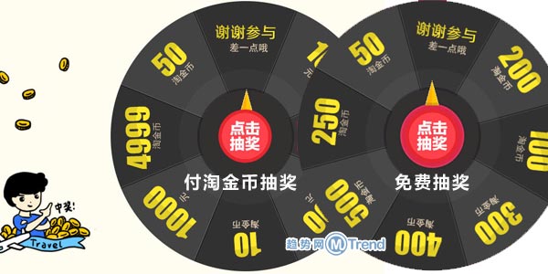 淘金币是淘宝网为用户提供的积分,持有淘金币的用户购买淘金币频道的商品可以抵钱,和天猫的天猫积分类似,此外,用户还可以用金币进行抽奖、秒杀、兑换等活动。不过平时的淘金币抽奖是需要扣除68淘金币才能有一次抽奖机会的,在淘宝1212万能盛典活动期间,用户可以在相应分会场进行免费抽奖活动。