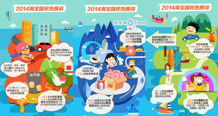 趋势网(微博|微信)讯:淘宝2014年国民热搜词排行榜出炉,全国各地网民爱在淘宝上搜什么热词?各省市买家在淘宝最常使用的搜索词是什么?各年龄段用户在天猫最感兴趣的产品特点有哪些?北京人上海人广州人深圳人香港人广东人杭州人厦门人爱搜词行为习惯大曝光。