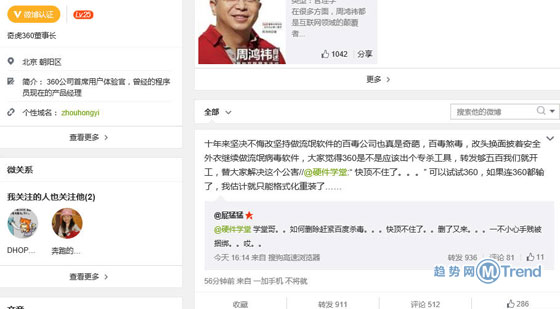 趋势网(微博|微信)讯:红衣大炮周鸿祎又耐不住寂寞要开炮了,虽然已经隐晦用词,比如“百毒”,不过不难联想这是针对老对手百度的。既然老周不言明,咱也不能乱对号入座,但难道360真的会出百度专杀工具吗,这条微博可是已经超过500的转发量了哦。