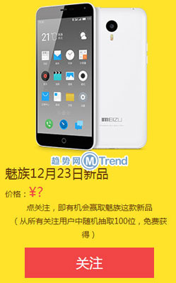 据悉,用户在12月23日22点前关注魅蓝Note,魅族会从所有关注者中选择100位发放新品。