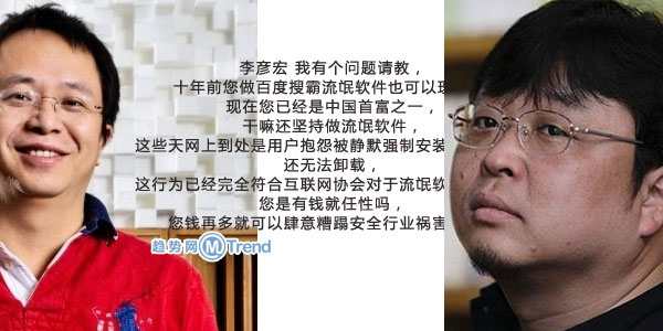 周鸿祎VS 李彦宏:2014年12月底,周鸿祎在微博向百度卫士和李彦宏开火,并表示 十年前做百度搜霸流氓软件也可以理解, 现在已经是中国首富之一干嘛还坚持做流氓软件,并称要出百度专杀工具。还赠送360儿童智能手环和苹果iPhone6 Plus力邀网友约李彦宏。不过李彦宏至今未表态回应。详情:《周鸿祎送iPhone6Plus喊你帮忙约李彦宏:下周公布材料》。