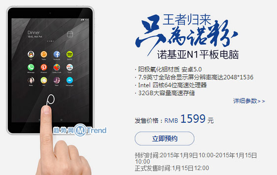 趋势网(微博|微信)讯:诺基亚N1平板电脑上市4分钟售出2万台,目前诺基亚N1仅在中国大陆上市发售,欧美地区还要再等等。诺基亚N1在哪里能预订?多少钱买到诺基亚N1平板电脑?