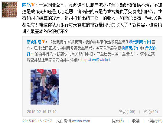 陶然微博全文:一家同业公司,竟然连司机账户流水和营业额都傻傻搞不清,不知道是故作无知还是用心险恶。滴滴快的只是为乘客提供了免费电招服务,乘客和司机结算的流水,是司机和出租车公司的收入,和快的滴滴一毛钱关系都没有!难道你认为银行每天存进的钱就是银行的收入了?就算黑,也请稍讲点最基本的常识好不?