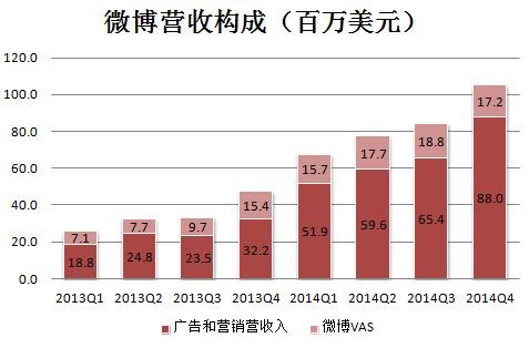 得益于活跃用户的稳定增长,微博在商业化上也迎来爆发。2014年第四季度,微博总营收达到1.05亿美元,并实现了940万美元的净利润,上市后首次实现单季度盈利。