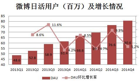 相比之下,微博增值服务在2013年出现过大幅增长,但2014年全年基本保持停滞不前。由于微博的DAU在温和上升,因此,这显示微博的收费会员服务对普通用户的吸引力越来越低。究其原因,微博的社交属性渐渐让位于媒体属性,普通会员充值的动力至少很难增长。所以,微博如果希望在非广告业务上获得更多的收入来源恐怕还需要去寻求更多的业务维度。