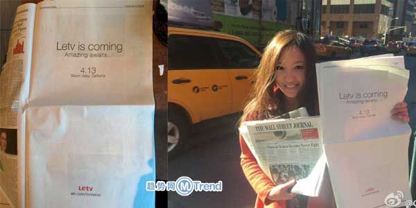 趋势网(微博|微信)讯:乐视在华尔街日报登了整版广告,宣布4月13日硅谷发布新品。