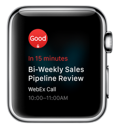屏幕定格在2015年4月24日晚12点29分44秒。今天,企业移动设备管理公司Good Technology公布他们的苹果手表应用。这个应用是Good的Good Work协同办公系统的一个衍生。这个应用允许手表佩戴者在手腕上就可以从Good Work获取邮件、日常通信。当互联网管理员可以控制那些显示信息通知时,应用者们就可以从Good Work获取邮件、日常通知。并且这个应用被安装后,只会显示寄件人和电子邮件主题。
