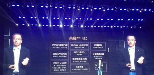 趋势网(微博|微信)讯:华为在刚刚结束的GMIC2015大会发布了荣耀4C新品,在网络制式上分为移动版、电信版和双4G版三种型号。荣耀总裁赵明做了《笨鸟,不等风》的主题演讲,阿里巴巴集团零售事业群总裁张建锋宣布了产品售价,荣耀畅玩4C将在天猫独家首发,移动版售价799,电信版899,双4G版999元。