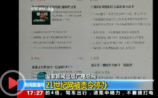 趋势网(微博|微信)讯:4月30日,国家 新闻 出版广电总局向社会通报了对21世纪网、《理财周报》和《21世纪经济报道》 新闻 敲诈案件的行政处理情况,其中21世纪网被责令停办,《理财周报》被吊销出版许可证,《21世纪经济报道》被责令整顿。