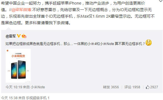 随后,乐视TV总裁梁军转发其微博称:“无边框概念,分为ID无边框和显示无边,乐视率先做出全球首个ID无边框手机,乐Max仅1.6mm 2K最窄显示边。无边框可不是黑色边框。”