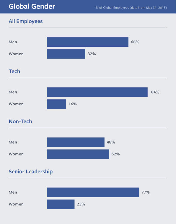 对Facebook的高层领导来说,事情是相当停滞。一年前高层中77%是男性,74%是白人,今年变成了77%和73%。