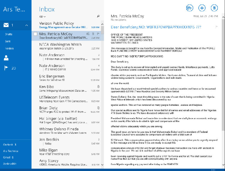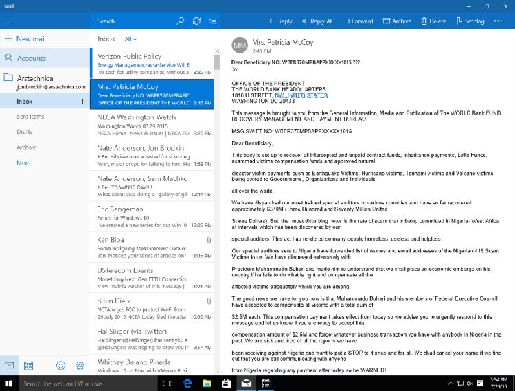 在一定程度上,我对Windows10邮箱的期望过高。从艰难起步的Windows8到更为实用的版本Windows8.1,微软的电子邮箱应用工具的股票价格一直是一个明显的上升状态。起初,Windows10邮箱的出现股票价格看起来应该会提升。为了保持微软能更快的返回操作系统的中心界面,Windows10和8.1版本的基本布局相同但是出现了更多功能的可视化而不是采用快捷键的方式.邮箱的窗口可以根据你的喜好作出调整,而不是只会运行然后告诉你程序已卡。对我来说,这种变化本身就使得它的邮件日历和其他应用程序比他的历届版本更加优秀,但是理所当然,Windows10邮箱也有错误,无奈的是Windows10邮箱本应该拥有一些Windows8.1邮箱一些基本的有用的部分但是却在新的版本中把这些去除了。