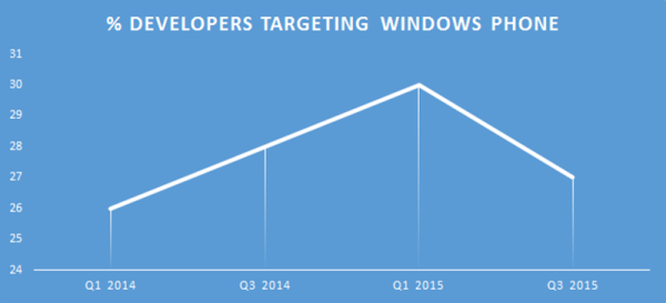 VisionMobile调查了13000多名移动开发者,结果显示开发者对WindowsPhone平台的兴趣度首次出现了下降,当然这与微软向Windows10Mobile平台过渡的战略有所关联。好消息是,有44%的移动开发者打算转向Windows10平台,还有28%的开发者几年前就计划开发 Windows8 应用。遗憾的是,这些数字并不是成功的保证,因为在2012年时,有57%的开发者都表示有意为WindowsPhone开发应用,可结果大家都心知肚明。
