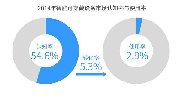 尽管Applewatch热度达到了空前,但对于智能可穿戴设备的认知上,并没有想象的那么乐观,调研数据显示,人们对智能可穿戴设备只有54.6%,而使用力更低,只有2.9%,转化率不到5.3%。在大众看来,这些智能可穿戴设备智能起到锦上添花的作用,并非如同手机是生活的必须品,因此,即便了解,但是否会主动掏钱去买去使用,都还是有待考虑的。