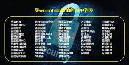 据不完全统计,目前网络上的信息都指向了百度的多款应用,这些应用是:百度地图、百度浏览器、百度贴吧、百度翻译、百度视频、百度手机助手、百度云、百度音乐、百度 新闻 、百度图片、百度输入法等,当然还有一些第三方的应用受到波及,因为使用了百度提供的SDK(软件开发工具包),多个热门应用如途牛旅游、万达电影等,直接影响的安卓用户量数以亿计。