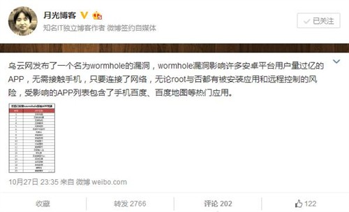 10月27日,知名科技博主“月光博客”在微博上发布了一个安卓平台高危漏洞的信息,并列出了受影响的APP名单。因为漏洞带来的后果极其严重恶劣,消息一经发布就在网络上被迅速疯传,吸引了大量业界人士和普通民众的关注。