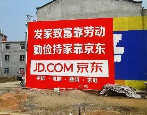 和阿里的进军一样,京东也刷了田间地头的墙:“发家致富靠劳动,勤俭持家靠京东”。值得一提的是,京东的“刷墙行动”非常用功,自 2013年第四季度开始,截至2014年3月,京东就已在全国145座城市狂热地刷下了超过 8000 幅刷墙广告。