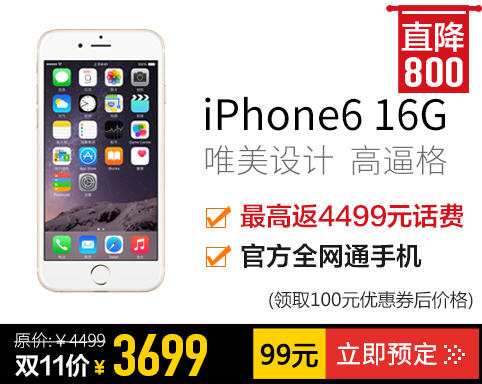 苹果iPhone手机满3000元减100元;魅族双十一领券最高省100元;三星S6 Edge下单立减600元;华为P8青春版降价200元;华为荣耀畅玩4X全网通版降价100元;努比亚Z9mini 2499元起;联想最高降300元;ZUK Z1最高优惠1200元;一加手机新品抢购;奇酷手机青春版999元起;小米手机直降200元;OPPO手机新品抢购;锤子坚果手机送惊喜福袋;华硕湖蓝版领券立减400元。
