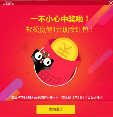 6、抽中的红包仅限2015年11月11日当天淘宝、天猫购物使用,逾期作废。