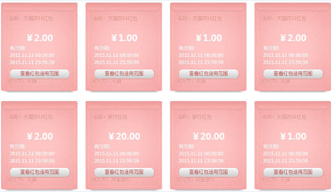 1.用户在“红包雨”活动期间可通过点击活动页面中不断下降的红包进行时长1分钟的抽奖,有机会获得双11红包(红包是无门槛折扣券产品服务,获得红包的消费者可以按照折扣券产品提供的折扣预算金额,以无门槛的条件在天猫和淘宝特定商家购物消费时凭券享受折扣,具体详见双11红包发放和使用规则) 或双11购物券。双11红包面额为:1元、2元、5元、10元、1111元。