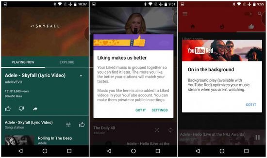 YouTube Red(高级付费)版本没有广告,且支持音频后台播放。YouTube Music 已经可以在美国区 Google Play 商店和 App Store 上下载。或是订阅了YouTube Red以及Google Play Music的用户可以用同一账户直接使用YouTube Music。负责开发YouTube Music应用的Manuel Bronstein说道:“不管如何发展,音乐是不会停的,人们想要观看和听音乐”。