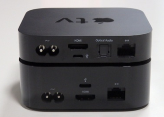 比第3代Apple TV厚度增加的背面端口比较。没有光音频的出口端,只有USB接口,有micro USB变为Type-C