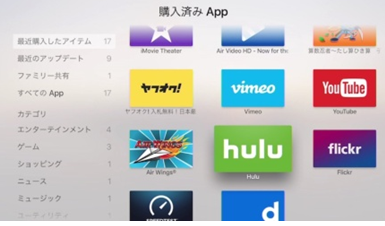 第3代配备的人气动画网站Hulu,在第4代中也没有。在Fire Tv、Nexus Player中,Hulu已作为App可以使用。Hulu作为可以用日本自己的地上波传送节目,需求很高。第4代Apple TV作为在客厅中使用的机顶盒,人们期待其可以尽快能下载Hulu。